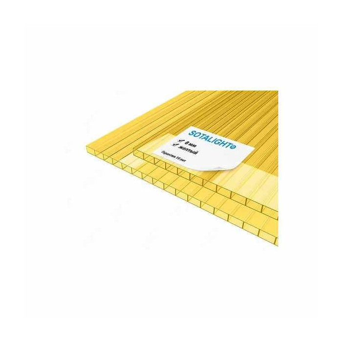 Сотовый поликарбонат 8 мм SOTALIGHT желтый 2100х6000 мм - это прочный и легкий материал, который отлично подходит для использования в различных строительных и дизайнерских проектах. Поликарбонат обладает высокой прочностью и устойчивостью к воздействию внешних факторов, что делает его идеальным выбором для создания крыш, навесов, ограждений и других конструкций.